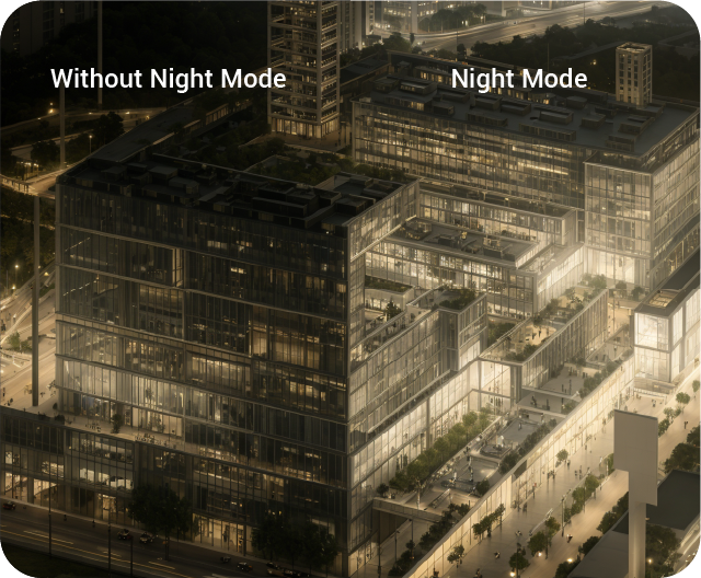 Night Mode automatically adjusts exposure for low-light environments, improving visibility during early mornings, evenings, or dimly lit scenes.