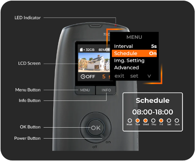 Brinno time lapse cameras offer smart scheduling to optimize recording times, save battery, and manage storage efficiently. With daily and weekly scheduling, users can limit recording to specific hours or days—ideal for projects that don’t need constant monitoring.